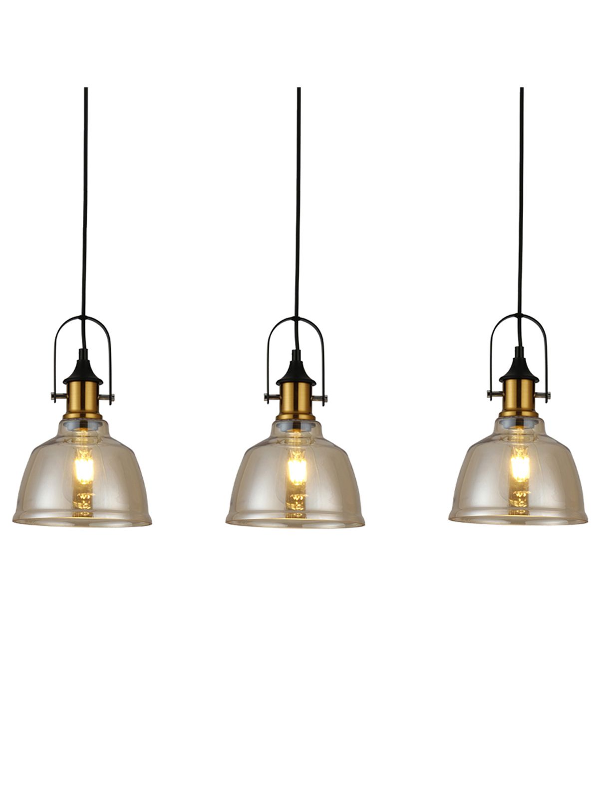 מנורת שלישיה לתליה, מאופיינת בסגנון תעשייתי נקי וייחודי, בגוון מוזהב